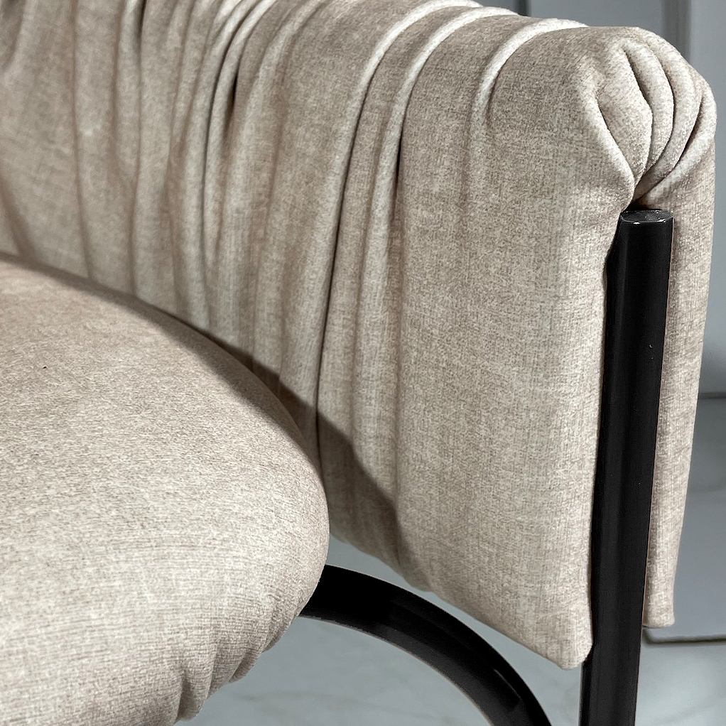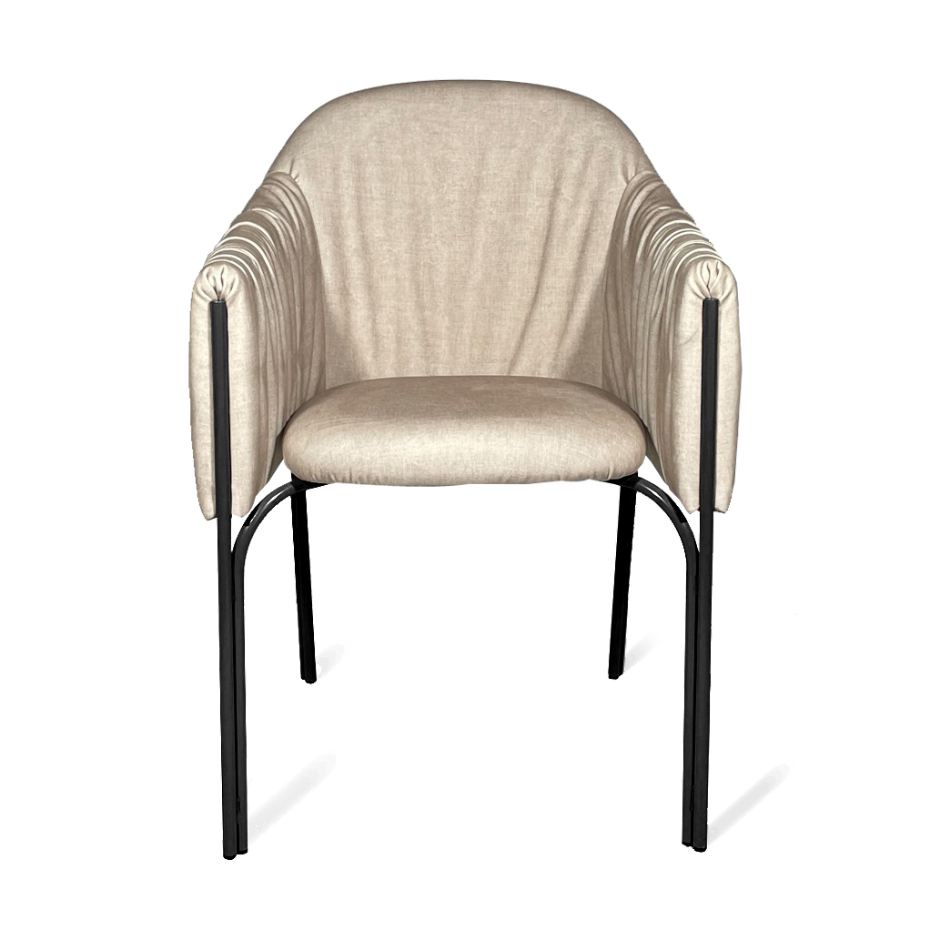 Typisch für das Modell Celine ist der harmonische Übergang von straffem zu gerafftem Material, der dem Stuhl eine faszinierende Spannung verleiht. Der opulente Faltenwurf vermittelt eine spielerische Leichtigkeit, während die straff bezogene, freischwebende Sitzfläche und die filigranen Stuhlbeine eine klare, elegante Linienführung unterstreichen.