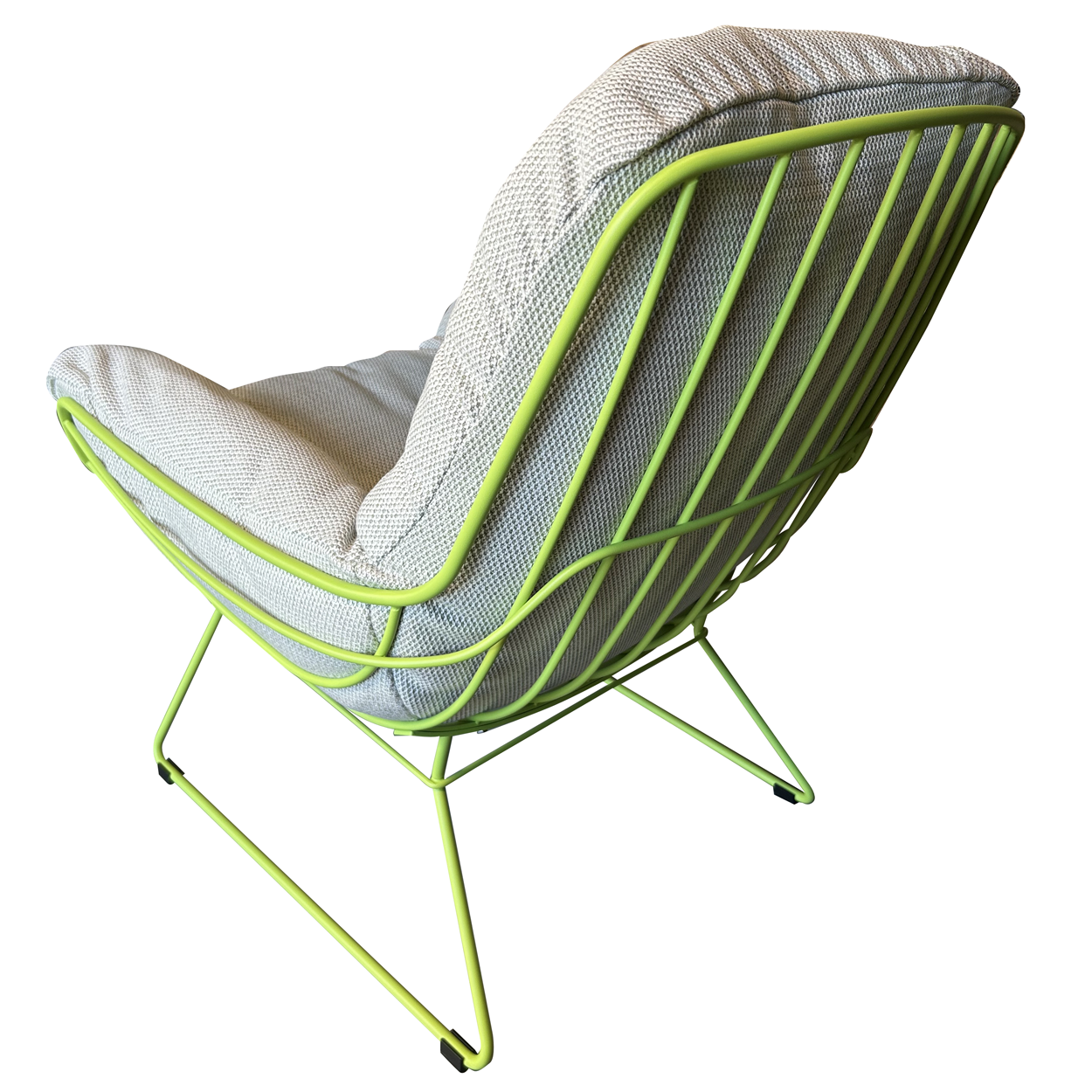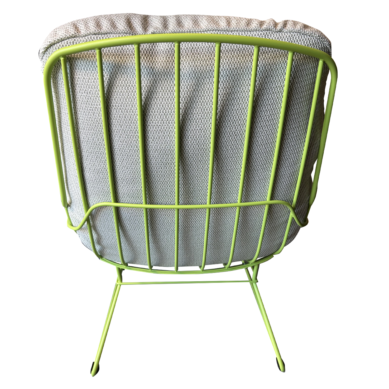 Das filigrane Drahtgestell in Fasergrün (RAL 6039) verleiht dem Stuhl eine frische, zeitgemäße Ausstrahlung und sorgt gleichzeitig für Stabilität und Leichtigkeit im Design. Für einen sicheren Stand und den Schutz empfindlicher Böden ist der Stuhl mit weißen Kunststoffgleitern ausgestattet.