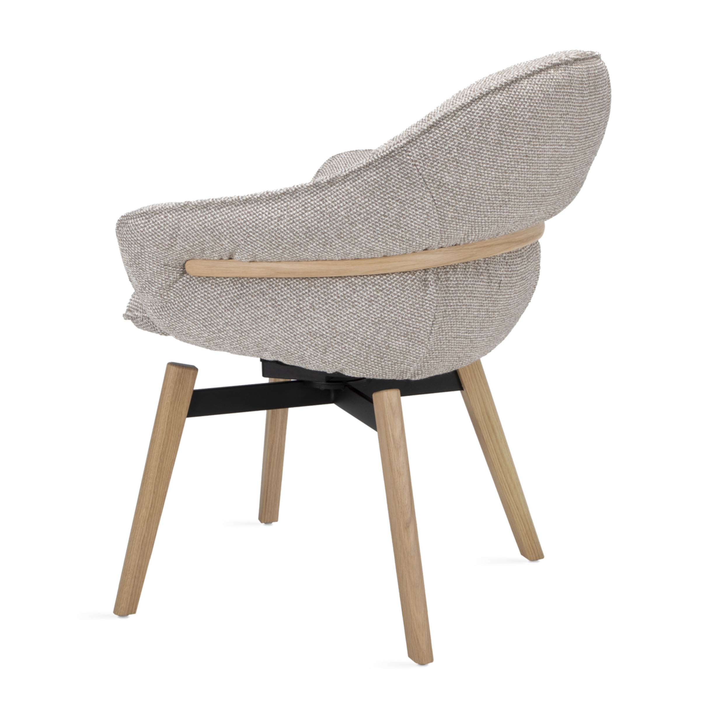 Das filigrane, zugleich stabile Holzgestell aus Eiche, geölt (WD001) bildet einen warmen, natürlichen Kontrast zum Stoffbezug. Die geölte Oberfläche betont die natürliche Maserung des Holzes und verleiht dem Sessel eine hochwertige, langlebige Anmutung.