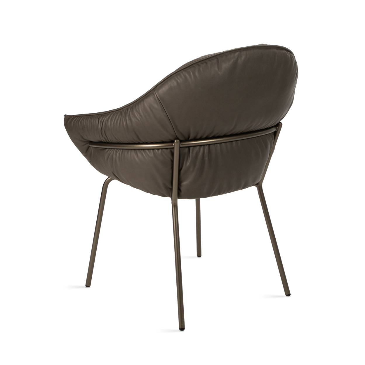 Ein typisches Produkt von Freifrau zeigt viele Facetten, wie auch der im Sommer 2023 eingeführte Stuhl Marie. Nun ist er auch in einer Designvariante ohne Armlehnen erhältlich. Der von Hoffmann Kahleyss entworfene Stuhl Marie verströmt eine herzliche Willkommensatmosphäre. Die platzsparendere Version ohne Armlehnen beeindruckt durch ihre Offenheit und lädt sowohl zum Entspannen als auch zum geselligen Beisammensein ein.Der Bezug besteht aus hochwertigem Leder Adora in der Farbe Walnut, das sowohl optisch und haptisch sehr ansprechend ist. Das Gestell in der Double Brand Colour Bronze Lasur ME025 wertet den Stuhl noch zusätzlich auf.