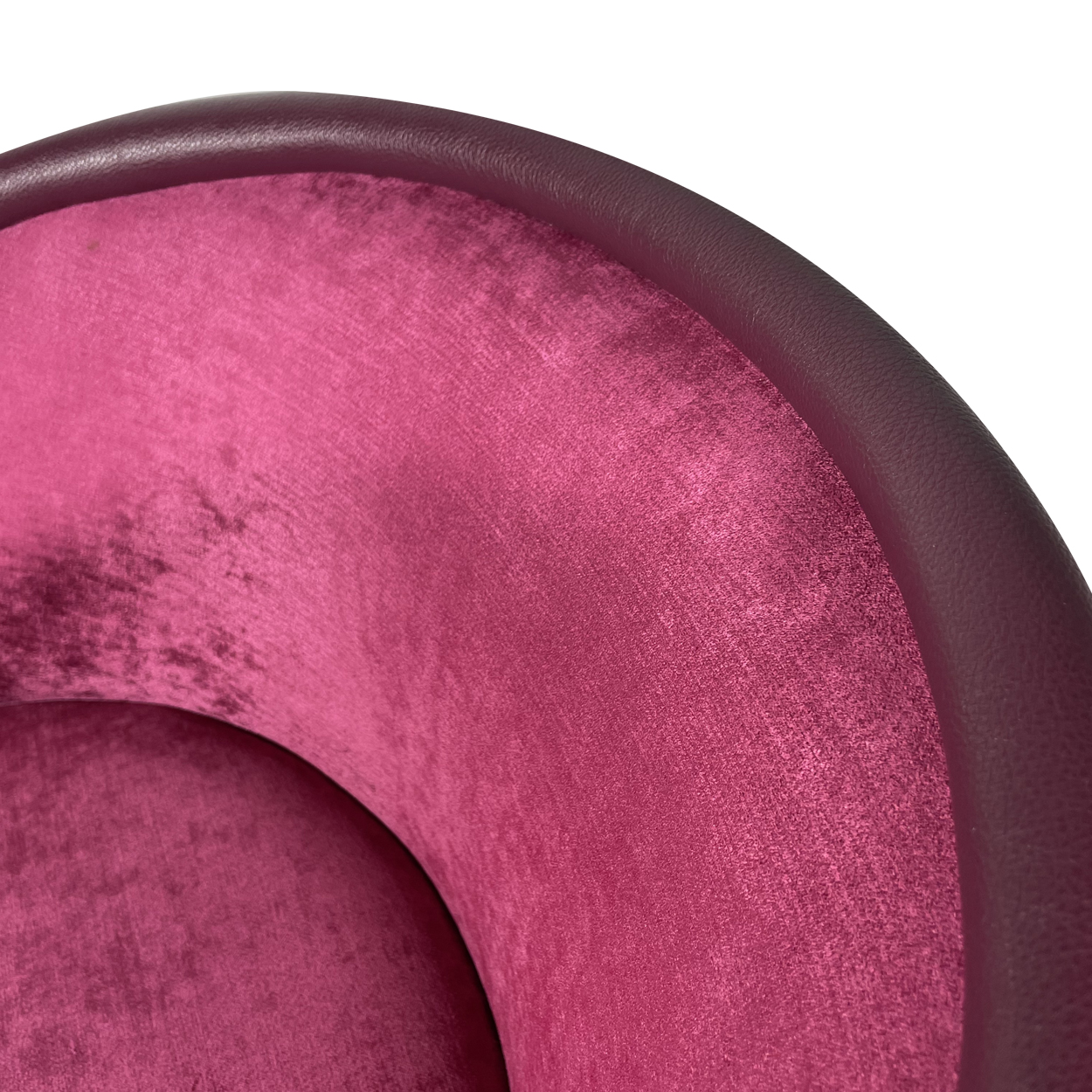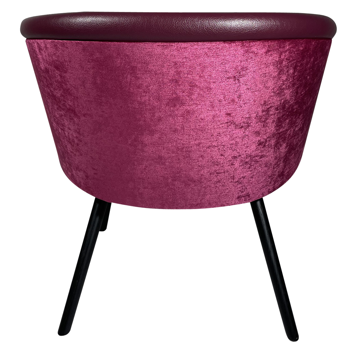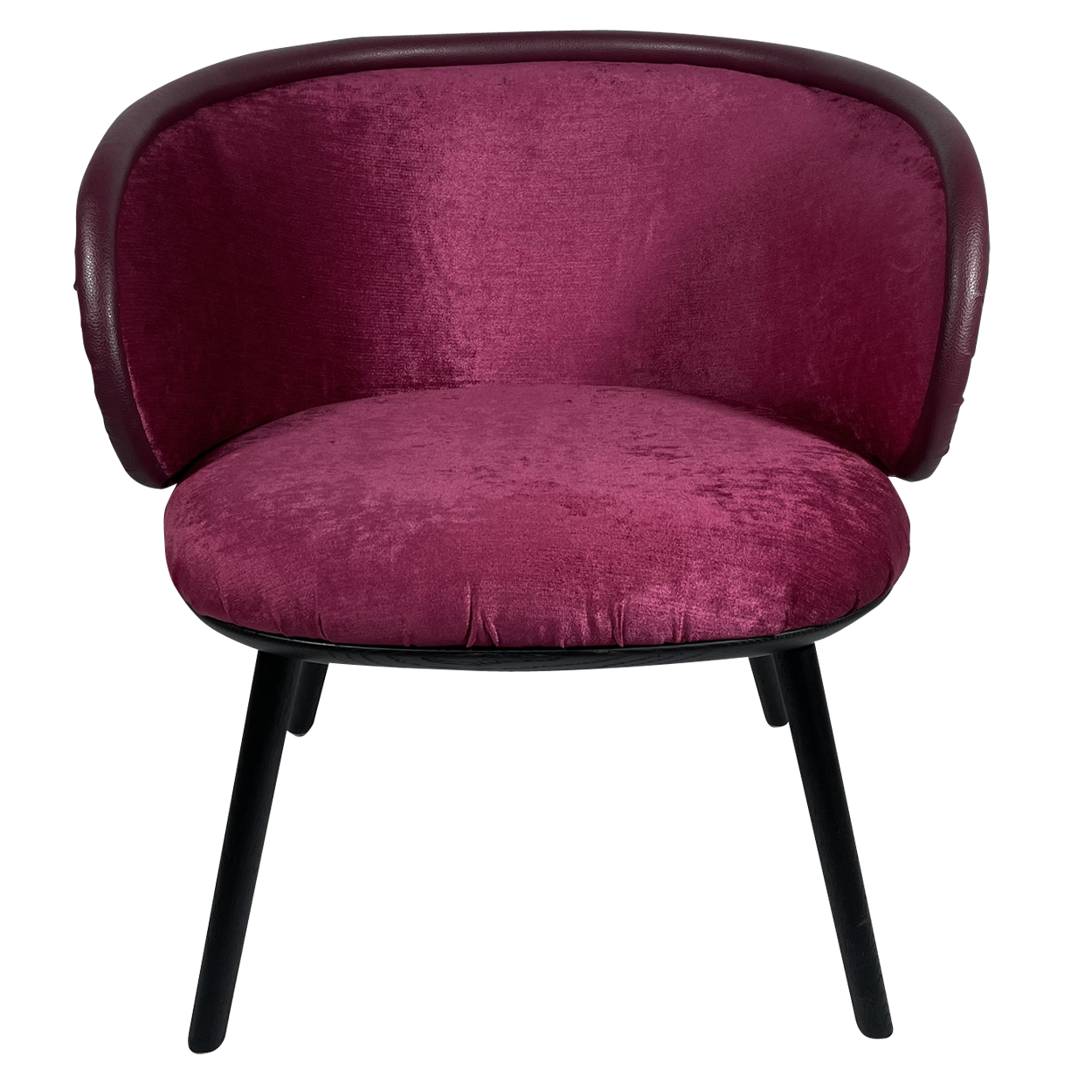 Der Ona Cocktail Armchair in der Uni-Variante, bezogen mit luxuriösem Chenille Lila, bietet eine perfekte Kombination aus zeitgenössischem Design und komfortabler Eleganz. Der feine Kragen aus veganem Leder in Lila unterstreicht das ästhetische Design und fügt eine Dimension der Nachhaltigkeit hinzu.